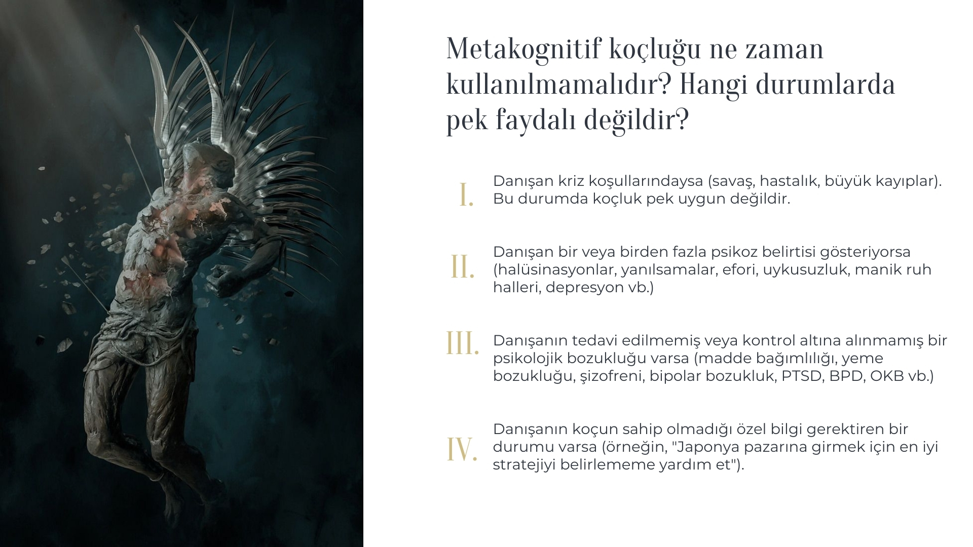 - Psikoterapiden genel olarak temel fark, çalışan müşterilerle çalışmamız ve öğretimde çok fazla uygulama ve doğrudan öneriler sunmamızdır. Koçun temel görevi, becerileri aktarmak ve müşteriyi tolere edilebilir bir hayattan (“0”) daha iyi bir hayata (“+1”) götürmektir. Terapinin amacı ise dayanılmaz bir durumdan (‘’-1’’) sıfır noktasına (‘’0’’) getirip oraya taşımaktır.